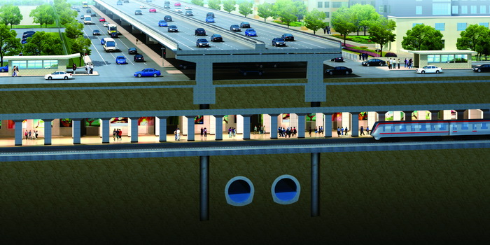 萬壽路電力隧道為鄭常莊熱電廠至八裡莊變電站110KV電力隧道沿萬壽路西側(cè)紅線穿越地鐵1號線的一段,南北向下穿復興路及地鐵1號線萬壽路車站,長約300m,結構型式為內(nèi)徑3m的小型盾構隧道,襯砌為250mm厚鋼筋混凝土管片。隧道南端設置始發(fā)井,北端設置接收井,緊鄰復興路南側(cè)設置中繼井,為該段隧道最低點。隧道覆土厚度最小13m,最大26m。盾構機穿越地層均為卵礫石地層,無地下水影響。在該電力隧道工程設計階段,地鐵十號線二期路由方案也沿萬壽路下穿地鐵1號線萬壽路車站,並在該路口設置有車站。為給十號線車站風道、出入口結構預留空間,電力隧道向下加大埋深,其最低點埋深達到29.5m。而下穿既有地鐵車站時兩結構間最小淨距也達到了11m。