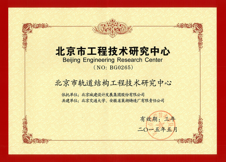 Recently, Beijing Municipal Science & Technology Commission (BMSTC) unveiled the 2014 authentification list of key laboratories and engineering and technology research centers in Beijing. After qualification review, expert appraisal and field investigation, Beijing Track Structure Engineering Technology Research Center (the research center) jointly applied by Beijing Urban Construction Design & Development Group Co., Limited (UCD), Beijing Jiaotong University and Anhui Chaohu Casting Factory Co., Ltd. was granted as a Beijing municipal engineering and technology research center.