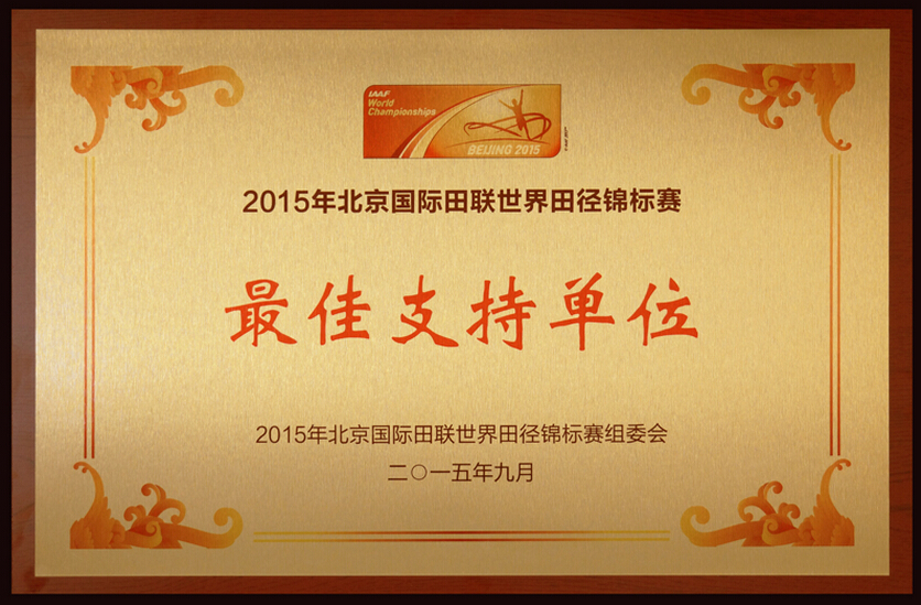 由於公司對(duì)2015年北京國(guó)際田聯(lián)世界田徑錦標(biāo)賽工作的積極支持,近日,公司被2015年北京國(guó)際田聯(lián)世界田徑錦標(biāo)賽組委會(huì)授予“最佳支持單位”,公司傅依萱同志也獲得個(gè)人榮譽(yù)證書(shū)。
