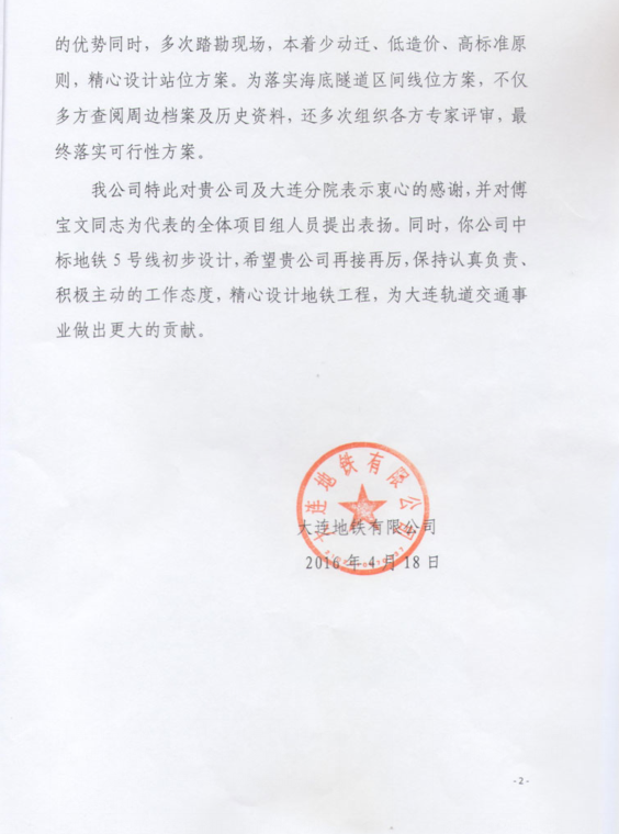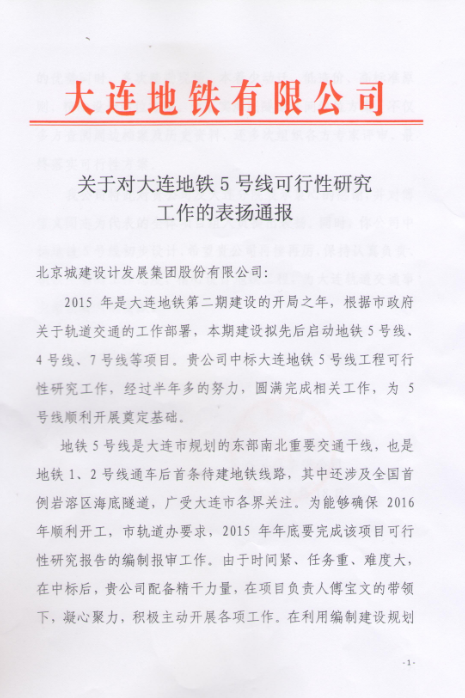 Dalian Metro Co., Ltd sent a letter to Beijing Urban Construction Design & Development Group Co., Ltd on April 18. In the letter, Dalian Metro gave favorable comments on the outstanding performance of the compiling work of the feasibility study on the Metro Line 5 in Dalian. It also pins high hope on the primary design of the project in the next step.
