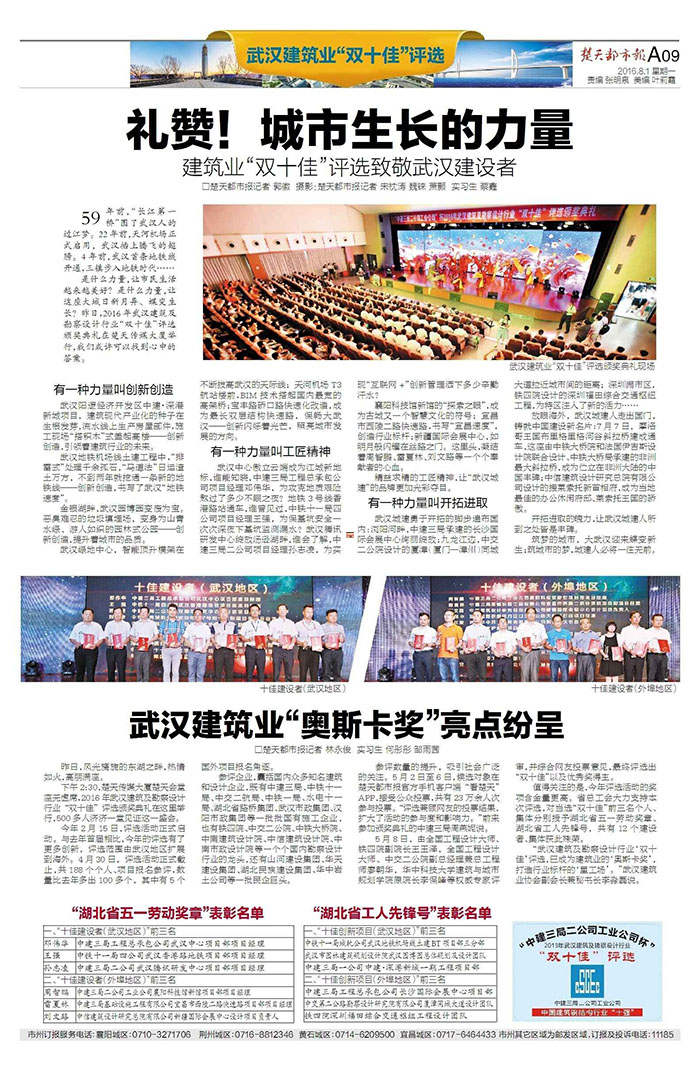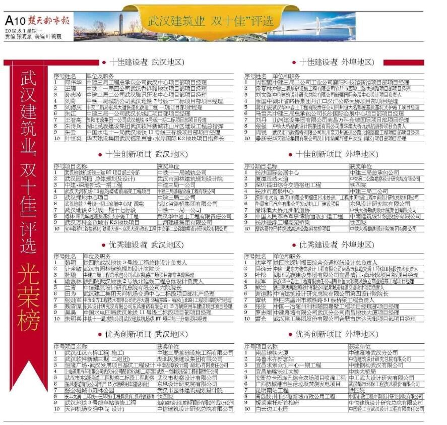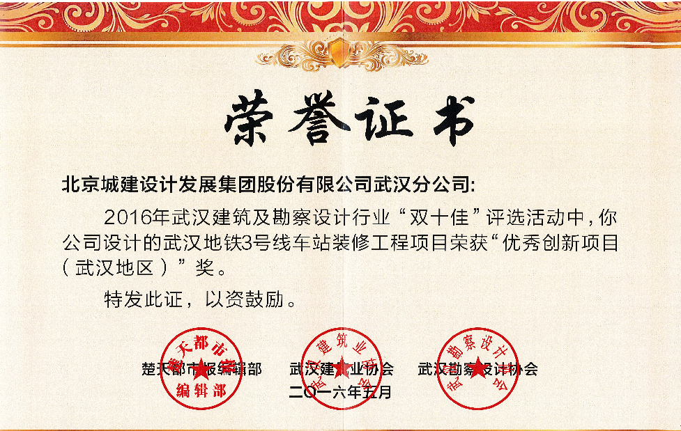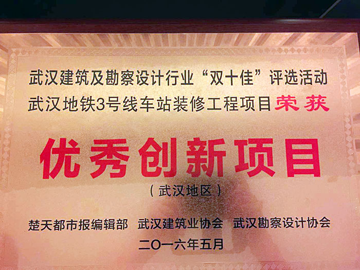 On July 31, 2016, the awarding ceremony was held at Chutian Media Building for the Activity of Appraising and Electing “Dual Top Ten Enterprises” in Wuhan Building, Investigation and Design Industry. The Wuhan Rail Transit Line 3 Station Decoration Project undertaken by UCD obtained the “Excellent Innovation Project (Wuhan)” in the Activity of Appraising and Electing “Dual Top Ten Enterprises” in Wuhan Building, Investigation and Design Industry in 2016. A batch of unsung heroes making contributions to the city construction appeared on the stage and ushered in the honors belonging to them.