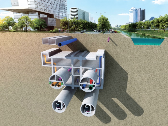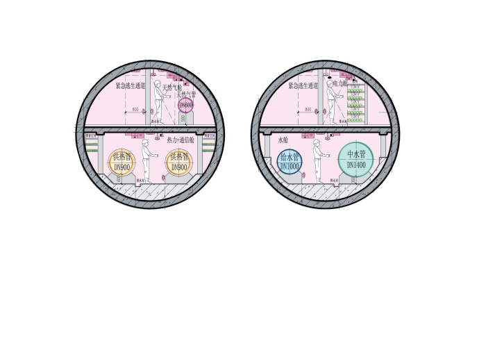 全線採用盾構施工工法,結構內直徑D=5.4m的盾構圓,形成兩個平行的綜合管廊。共設29座節(jié)點井,並將緊急逃生通道出入口(兼人員出入口)、進風風亭、排風風亭、吊裝口、及管線分支口進行有機整合,使附屬設施系統(tǒng)功能在節(jié)點井統(tǒng)一實現(xiàn)。入廊管線涵蓋:10kV電力電纜、通信管道、給水管線、中水管線、供熱管線、天然氣管線,同時預留電力電纜和通信管道托架。