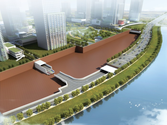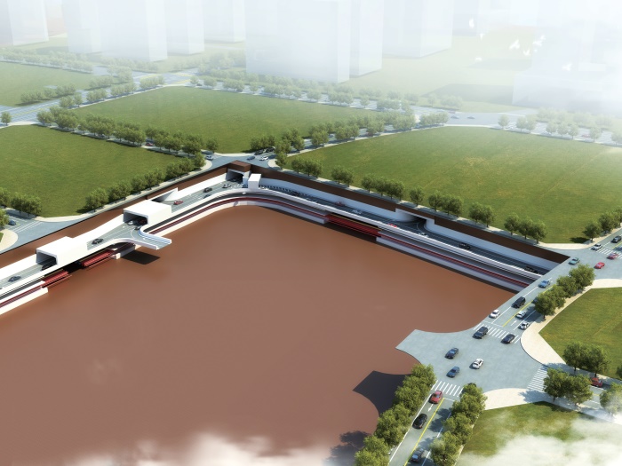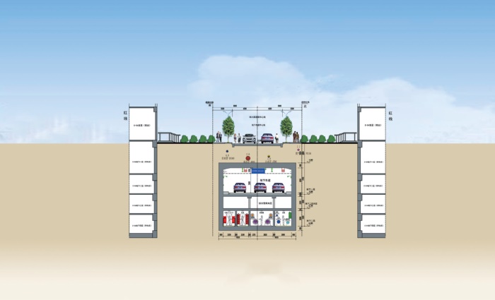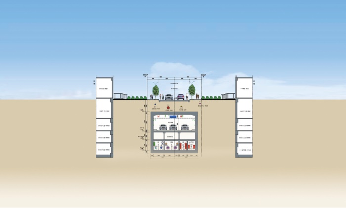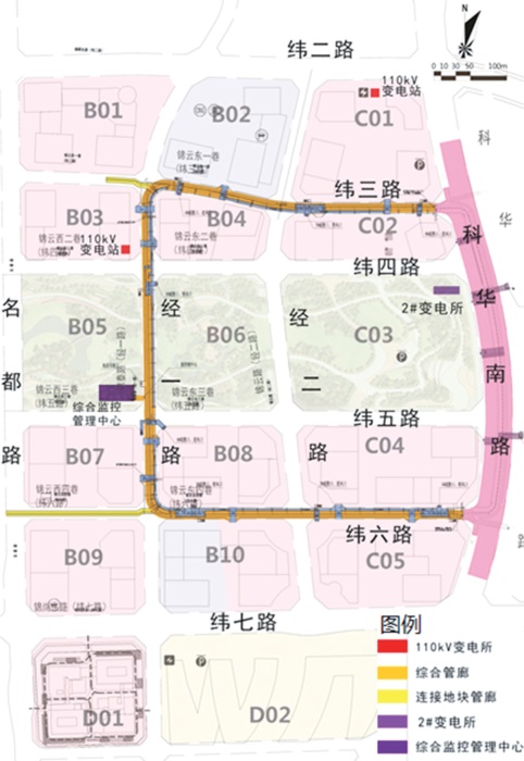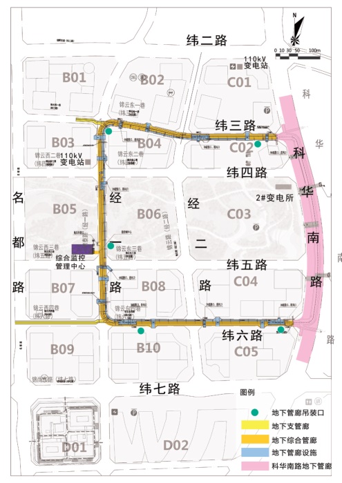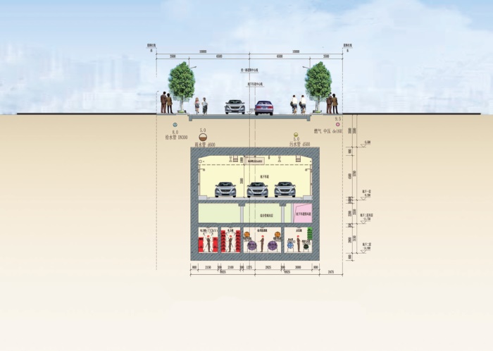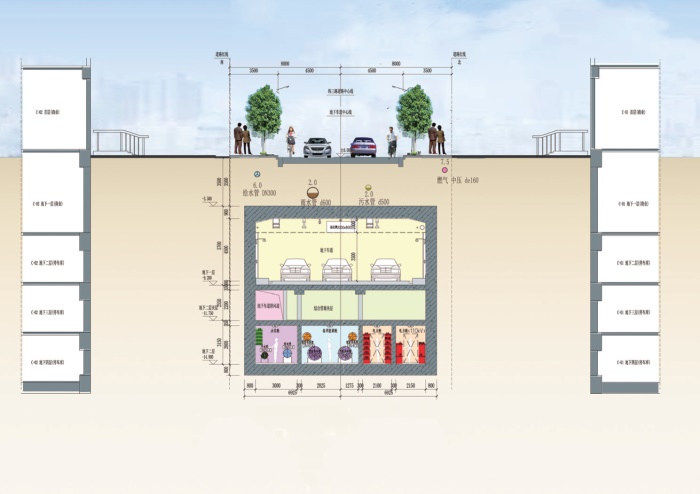 入廊管線含電力電纜、通信管道、給水管、供冷管、供熱管、中水管,燃氣管、排水管(雨水、污水管線)未入廊。地下車道和綜合管廊主線隧道疊合設(shè)置於錦雲(yún)東一巷(緯三路)、錦泰路(經(jīng)一路)、錦雲(yún)東四巷(緯六路)道路下。地下結(jié)構(gòu)分三層佈置,地下一層為地下車道層,地下二層夾層為支管廊層,地下二層為地下綜合管廊層。