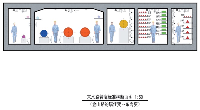 The underground pipe racks at Huayuankou Township of Huiji District is located at Jingshui Road and East Yingbin Road, with a planned total length of 5.3 kilometers and a total investment of 642 million Yuan or so. Four-cabin and five-cabin sections are adopted at Jingshui Road, with the main box room of the four-cabin section being 14.2 meters wide and 4.0 meters high and the main box room of the five-cabin section being 16.25 meters wide and 4.0 meters high. Four-cabin and five-cabin sections are adopted at East Yingbin Road, with the main box room of the four-cabin section being 15.3 meters wide and 4.1 meters high and the main box room of the five-cabin section being 17.4 meters wide and 4.1 meters high.