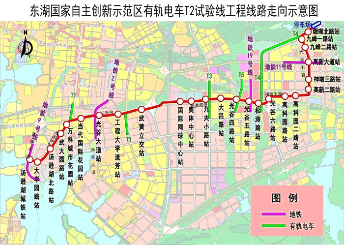 T2線工程秉承TOD設(shè)計理念,連接?xùn)|湖創(chuàng)新示範區(qū)西部建成區(qū)與東部拓展區(qū),支撐主軸東拓發(fā)展,服務(wù)於WTA、奧體中心及光穀中心城。線路起于湯遜湖城鐵站,止于珊瑚北路站,途經(jīng)天恒路、大學(xué)園路、三環(huán)線、高新三路、神墩五路、光谷七路、九峰一路。線路全長19.2km,設(shè)站25座(其中高架站3座,其它為地面站),設(shè)停車場一座。T2線與4條地鐵線路形成換乘,T1、T2線在三環(huán)線段共線運營,共線段兩端三方向互聯(lián)互通,實現(xiàn)兩條線路,6個交路的靈活運營。