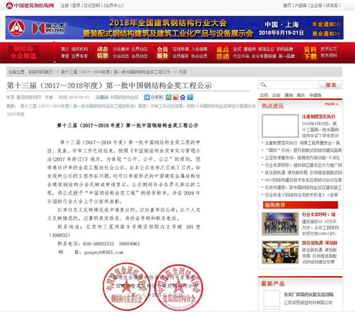 4月23日,中國(guó)建築金屬結(jié)構(gòu)協(xié)會(huì)建築鋼結(jié)構(gòu)分會(huì)官方網(wǎng)站公示第十三屆(2017~2018年度)第一批中國(guó)鋼結(jié)構(gòu)金獎(jiǎng)工程,由北京城建設(shè)計(jì)發(fā)展集團(tuán)投資建設(shè)的遵義鳳新快線建設(shè)工程三標(biāo)段鋼結(jié)構(gòu)工程獲得2017-2018年度第一批金獎(jiǎng)工程,這是貴州省首個(gè)獲得中國(guó)鋼結(jié)構(gòu)金獎(jiǎng)的市政橋樑鋼結(jié)構(gòu)工程項(xiàng)目,也是遵義市首個(gè)獲得中國(guó)鋼結(jié)構(gòu)金獎(jiǎng)的工程。據(jù)悉,"鋼結(jié)構(gòu)金獎(jiǎng)"是中國(guó)建築鋼結(jié)構(gòu)行業(yè)工程質(zhì)量的最高榮譽(yù)獎(jiǎng)。此次公示的第一批中國(guó)鋼結(jié)構(gòu)金獎(jiǎng)工程經(jīng)公示無(wú)異議後正式授予“中國(guó)鋼結(jié)構(gòu)金獎(jiǎng)工程”榮譽(yù)稱號(hào),並將在2019年全國(guó)的行業(yè)大會(huì)上宣傳表彰。