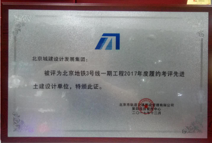 北京地鐵3號(hào)綫一期設(shè)計(jì)團(tuán)隊(duì)獲業(yè)主頒發(fā)優(yōu)勝設(shè)計(jì)單位獎(jiǎng)牌及先進(jìn)個(gè)人獎(jiǎng)狀