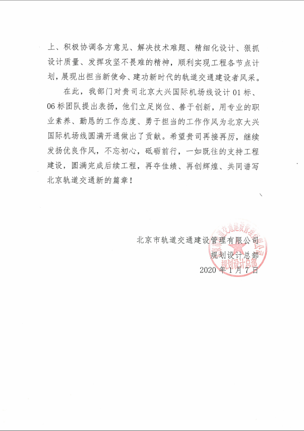 Beijing Metro Construction Administration Corporation Ltd. sent a commendatory letter to bestow praise on UCD’s design team for Daxing International Airport line in Beijing. Daxing International Airport Line was built and opened to traffic before the 70th anniversary of the founding of the People’s Republic of China. On Sep. 25, 2019, Chinese President Xi Jinping inspected the line and took a ride on the line, and made important instructions, such as “Urban rail transit is the orientation for the development of transportation in modern big cities. Developing rail transit is an effective way for tackling urban diseases, as well as an efficient way for building green and intelligent cities”, “Beijing should continue to energetically develop rail transit, construct comprehensive, green, safe, intelligent, stereoscopic and modern urban transportation systems, always maintain the most advanced international levels, and forge itself into a modern international metropolis” and “Transportation is the first mover for urban modernization. We should establish advanced management concepts, apply modern information technologies, to improve the levels of intelligentized and facilitated operation and management”.