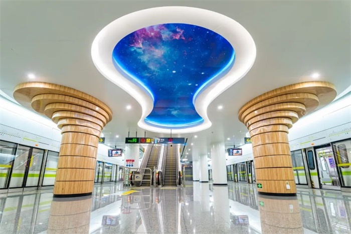成都軌道交通8號線一期工程屬於城市軌道交通線網(wǎng)中的重要線路,主要承擔(dān)中心城區(qū)內(nèi)部出行,兼顧週邊組團與中心城區(qū)的聯(lián)繫功能,與線網(wǎng)換乘點較多,起到為線網(wǎng)收集客流、提高軌道交通分擔(dān)率的作用;本工程採用國產(chǎn)A型車,6列編組,南起蓮花站,北至十裡店站,線路全長為28.97km,全為地下線共設(shè)車站25座,全為地下站,其中換乘站14座,設(shè)元華車輛段一座與5號線、9號線共址共用。8號線一期所經(jīng)區(qū)域覆蓋眾多教育、音樂及文創(chuàng)產(chǎn)業(yè),故將“音樂地鐵,國際文創(chuàng)”作為本線路設(shè)計主題,以文創(chuàng)方式多維表現(xiàn)音樂主題的地鐵空間,個性鮮明,獨具特色。其中有5座重點藝術(shù)站,分別為川大江安校區(qū)站、芳草街站、川大望江校區(qū)站、東郊記憶站、理工大學(xué)站。