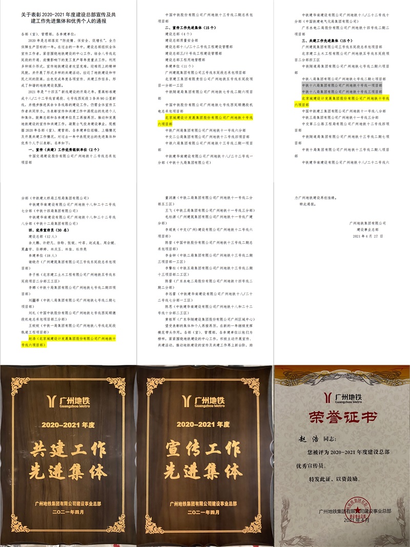On the afternoon of April 29th, in the commendation of “2020-2021 Advanced Group and Outstanding Individual in Publicity and Co-construction Work” by the Guangzhou Metro Construction Headquarters, the Guangzhou Metro Line 10 project has achieved fruitful results and won the titles of “Advanced Group in Co-construction Work” and “Advanced Group in Propaganda Work”, making UCD the only unit winning the honor among all 11 units involved in the construction of the Line 10 project. Comrade Zhao Hao was awarded the title of “Excellent Propagandist”, being the only person having received this honor. UCD won the most awards among all units involved in the construction of Guangzhou Metro Line 10.