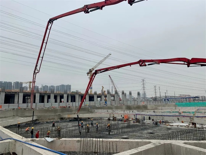 Recently, a good news has spread again on Guanggang New Town Station for Guangzhou Metro Line 10 constructed by UCD’s rail construction company! With the completion of the last roof concrete pouring, the capping of the main structure of Guanggang New Town Station was completed successfully one week ahead of the scheduled node, winning good luck for the sprint stage of the subsequent construction in 2022. The Guanggang New Town Station is the third capped station on Guangzhou Metro Line 10, and is also the station with the largest single floor area on this route.