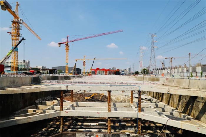 The north side of Guanggang New Town Station is close to 110kv and 220kv overhead high-tension cables, and the minimum clearance altitude under the high-tension cables is only 5 meters, making it impossible to conduct normal lifting operation under the existing conditions. Therefore, UCD scientifically optimized the construction scheme and, to skillfully avoid the high-tension cables, UCD specially adopted the reverse circulation drilling rig with lower height, and adopted the method of "inverted transportation in the pit with excavation at a single side" for earthwork in the foundation pit; In addition, considering that the lifting can only be made with the crane on the south side of the foundation pit, UCD chose the side wall opposite top support system for the lifting to conduct siding wall integral concreting, which substantially expedited. the construction progress and thus successfully completed the construction with the security of the high-voltage electric tower being ensured.