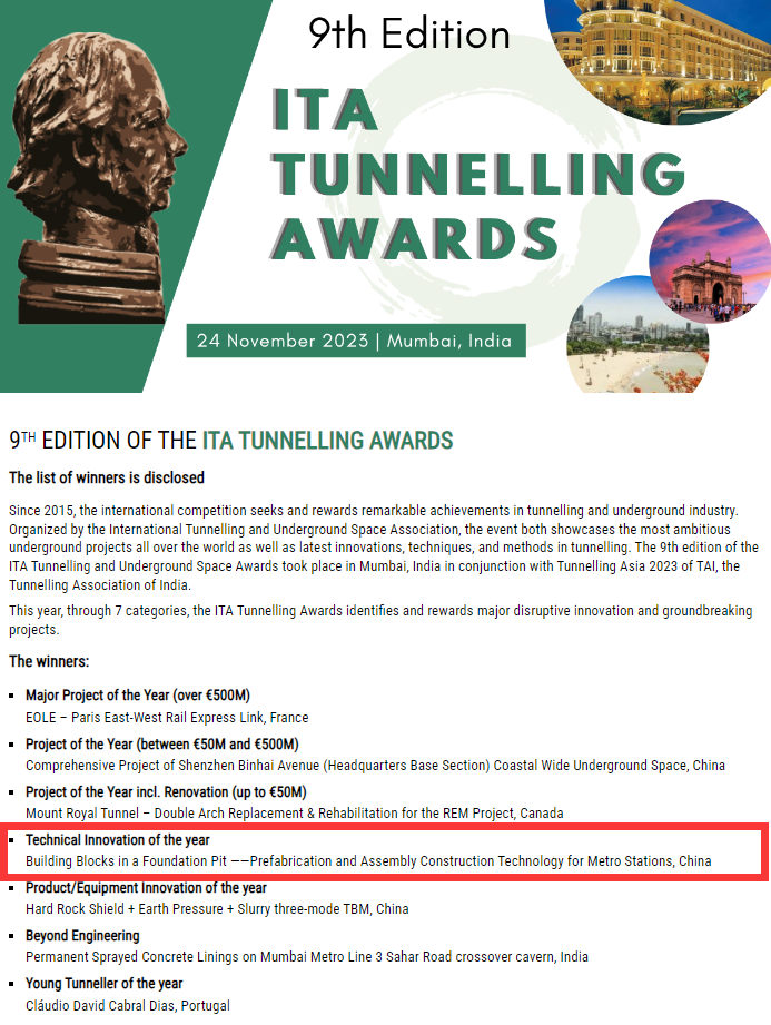11月24日,第九屆(2023)國際隧協大獎揭曉,公司城市軌道交通綠色與安全建造技術國家工程研究中心牽頭研發(fā)的“地鐵車站預製裝配建造技術”,榮獲年度唯一技術創(chuàng)新大獎。