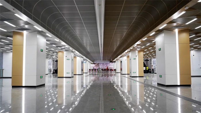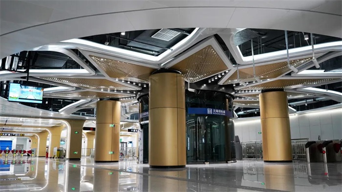 作為線路特色站,紅旗廠站設(shè)計主題為“科技驅(qū)動”,提取發(fā)動機的造型和星空元素,打造了兼具科技感、趣味性和浪漫色彩的建築空間。同樣作為特色車站的水流站,將夕陽西下的水流光影美學(xué)融入設(shè)計,提取靈動的曲線元素以及夕陽的漸變色彩進行融合排布,展現(xiàn)了現(xiàn)代建築與自然美學(xué)的完美結(jié)合。